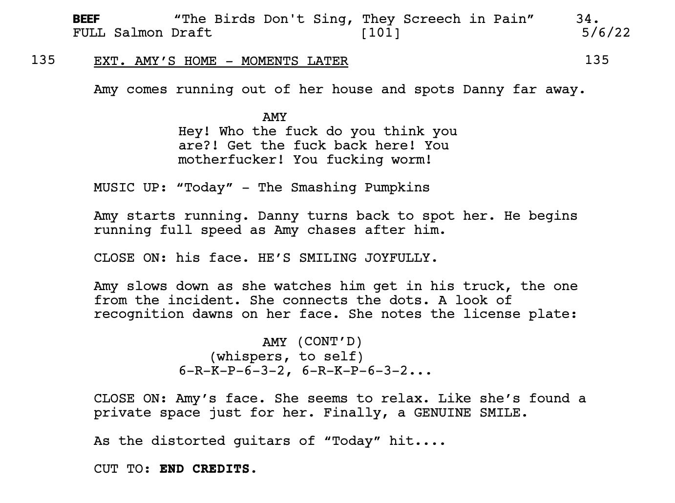 Notice that the script just says “GENUINE SMILE.” Ali could have burst into giggles. She could have yelled to the heavens with joy. She could have done a full villainous laugh. All of those choices would work for the character.